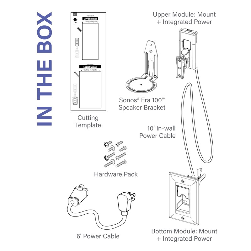- Comprehensive kit includes top & bottom module, cutting template, install manual, 10 ft in-wall power cable, 6 ft extension cord, hardware, and brackets to work with both rear and bottom mounted speakers.