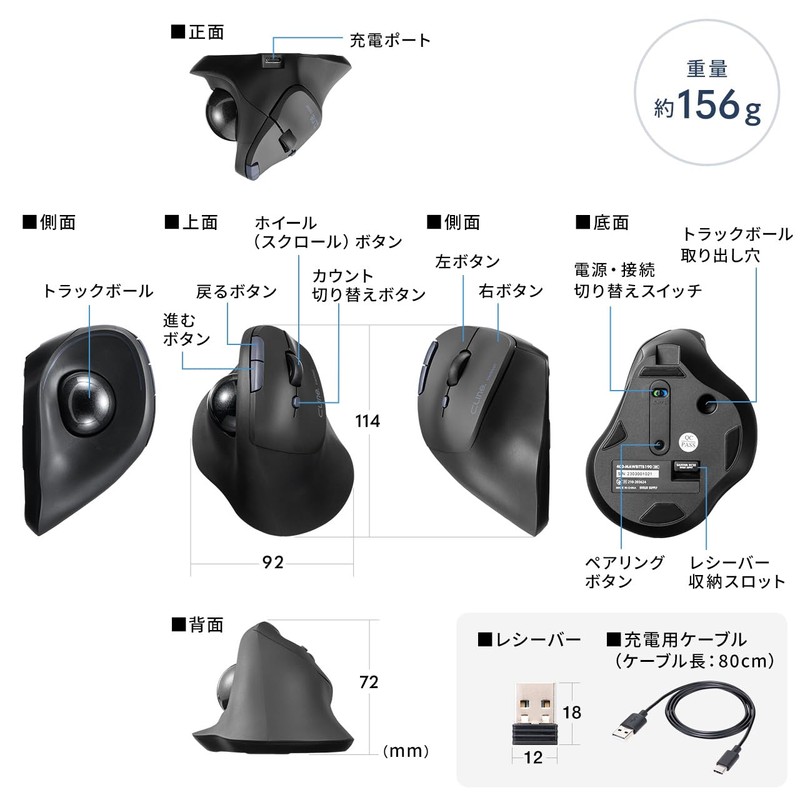 Sanwa Direct 400-MAWBTTB190BK Trackball, Ergonomic Mouse, Silent, Wireless, Bluetooth, 2.4 GHz, Includes Back/Forward Button, Rechargeable,
