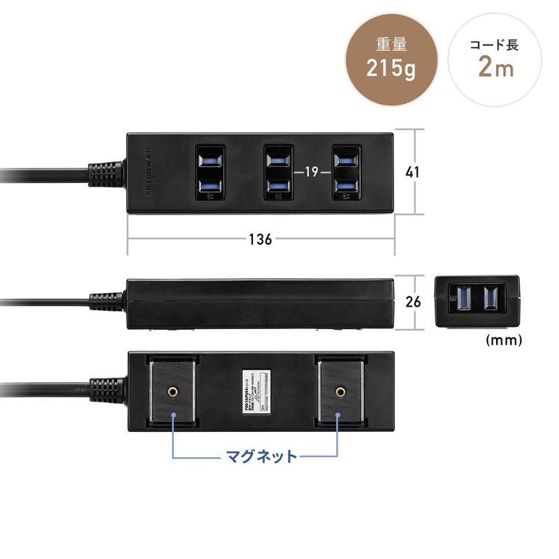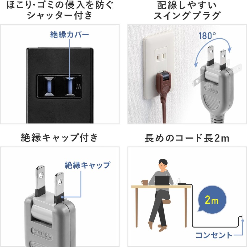Sanwa Direct 700-TAP054-2BK Power Tap, 4 Outlets, 6.6 ft (2 m), Magnet, Lightning Guard, Dust Prevention, Swing Plug, Black
