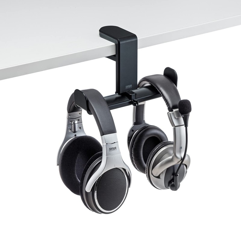 Sanwa Supply PDA-STN19BK Headphone Hook (W Type), 2 Units, 360° Rotation, Spring Type Clamp