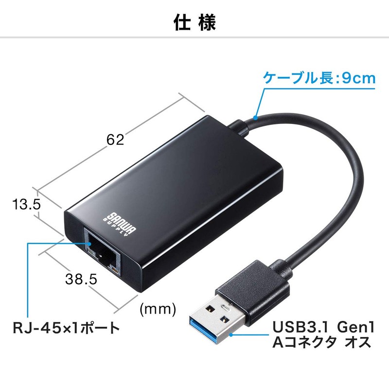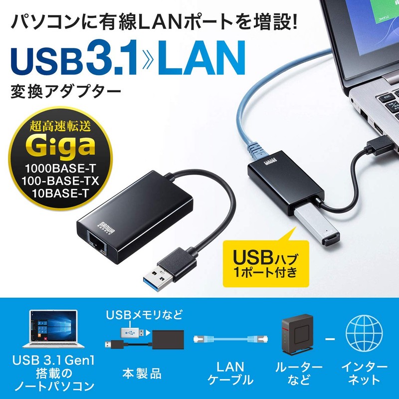 - Supports USB3.1 Gen1 (USB 3.0) and supports Gigabit (1000BASE-T) communication. Allows high-speed network communication even on computers without wired LAN ports