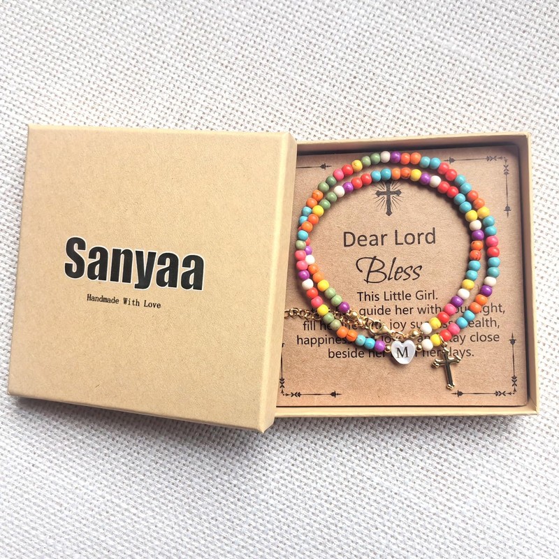 Sanyaa Cross Initial Heart Necklace Colorful Beaded First Communion Baptism Gifts Choker Necklace (Cross #1, T)