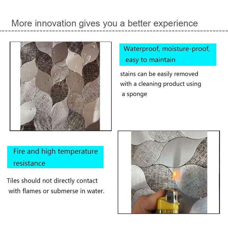 Suitable for decoration for kitchen backsplash, bedroom walls, bathroom backsplash, laundry room, washbasin etc. The surface of the tiles is aluminum, stainless steel, scratch-resistant, easy to clean, and a damp cloth is enough to remove oil.