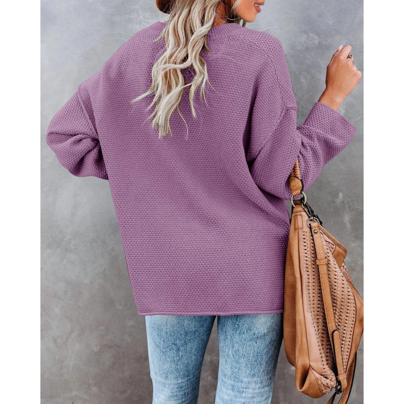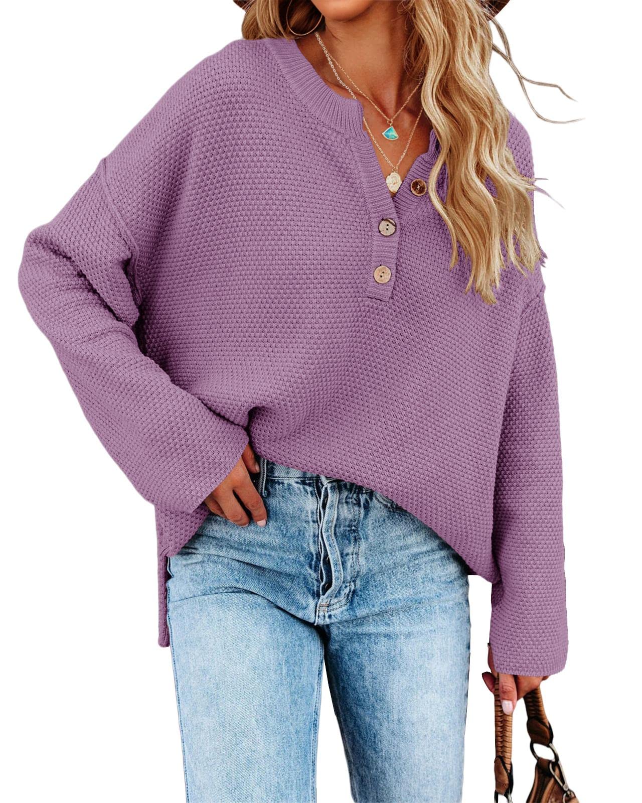 - Oversized pullover sweaters features: v neck, crew neck, button up, batwing tops for women, womens henley tops, comfy, casual slouchy style, loose fit, side split, drop shoulder, solid plain color knit blouse.