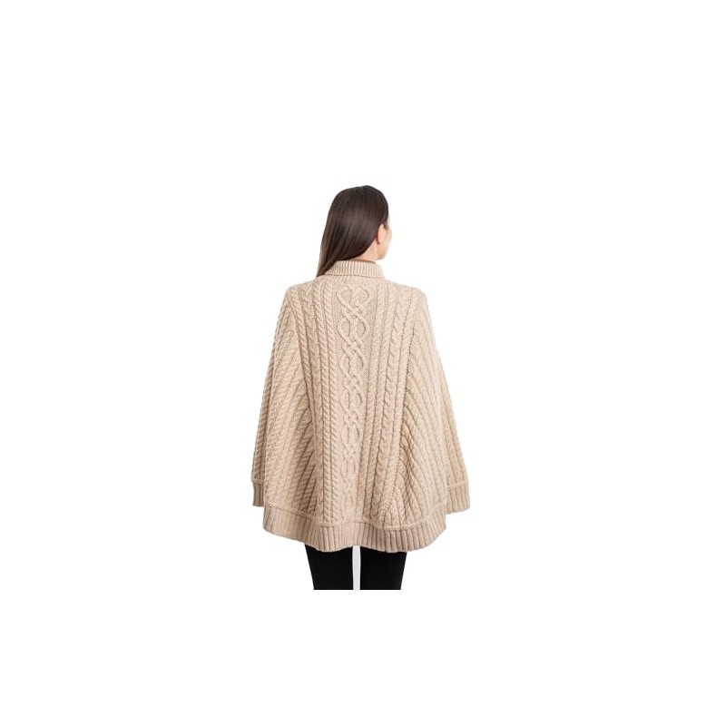 SAOL 100% Merino Wool Cable Knit Ladies Irish Aran Poncho Cardigan (Parsnip,S-M)