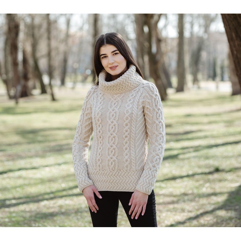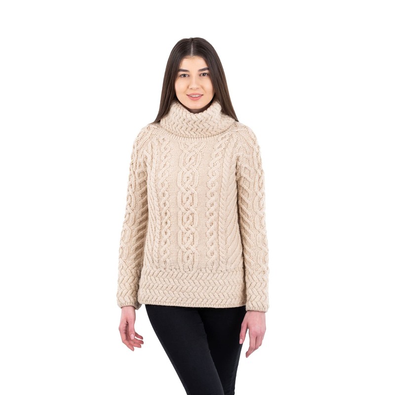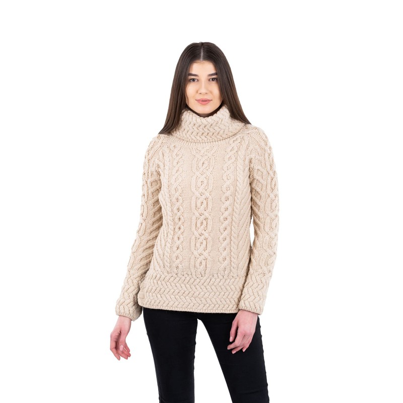 - RIBBED TRIM: Complementing the bold ribbing on the funnel neck collar is ribbed trim on the cuffs of the sleeves and the hem that balance out the elaborate Aran stitching of the sweater with a sharp finish. "