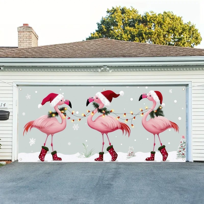 - Fun Christmas Design: Saoplasa Christmas garage door banner features three pink flamingos wearing Santa hats, boots, and string lights with snowflakes, creating a playful festive backdrop for home and holiday party decoration.