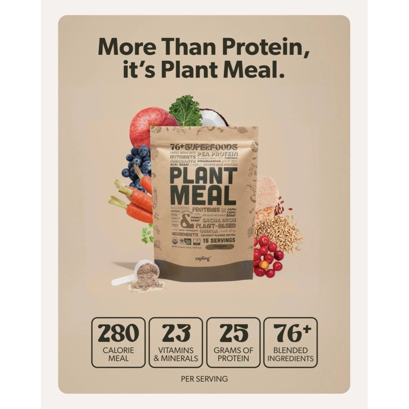- More than just protein: Every serving of Plant Meal contains 76+ Organic Superfoods, Organic Plant-Based Proteins, Vitamins & Minerals, Organic Adaptogens, Organic Super Greens, & Plant-Based ingredients. Find Camu Camu, Pea Protein, Sacha Inchi, Chia & Flax, Reishi Mushroom, Ashwagandha, Coconut Milk, & more.