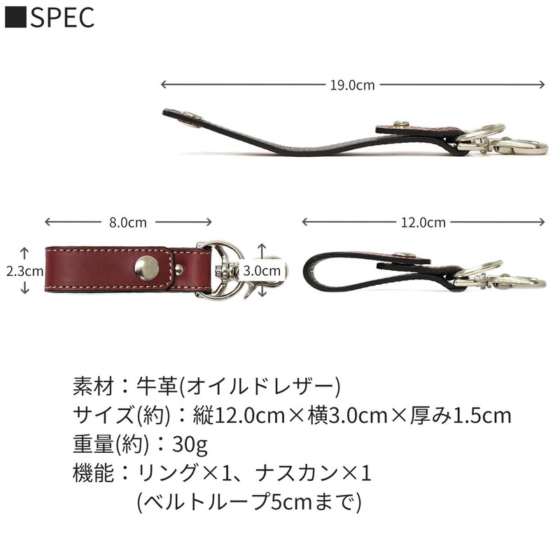 - Material: Cowhide leather (oiled leather); Size (approximate): Height 4.7 x Width 1.2 x Thickness 0.6 inches (12 x 3.0 x 1.5 cm); Weight (approximate): 1.1 oz (30 g); Functions: 1 x ring and 1 x claw clasp (belt loop up to 2 cm)