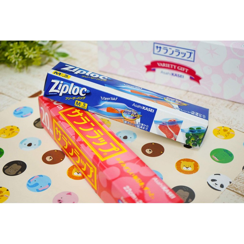 - Asahi Kasei Saran Wrap 8.7 x 66.6 ft (22 x 20 m) Gift Set with 5 Medium Ziploc Freezer Bags. Wrapped with 10 cute animal wrapping paper. Those who receive them will be soothing with the animal feelings ♪ Of course, you can buy it too