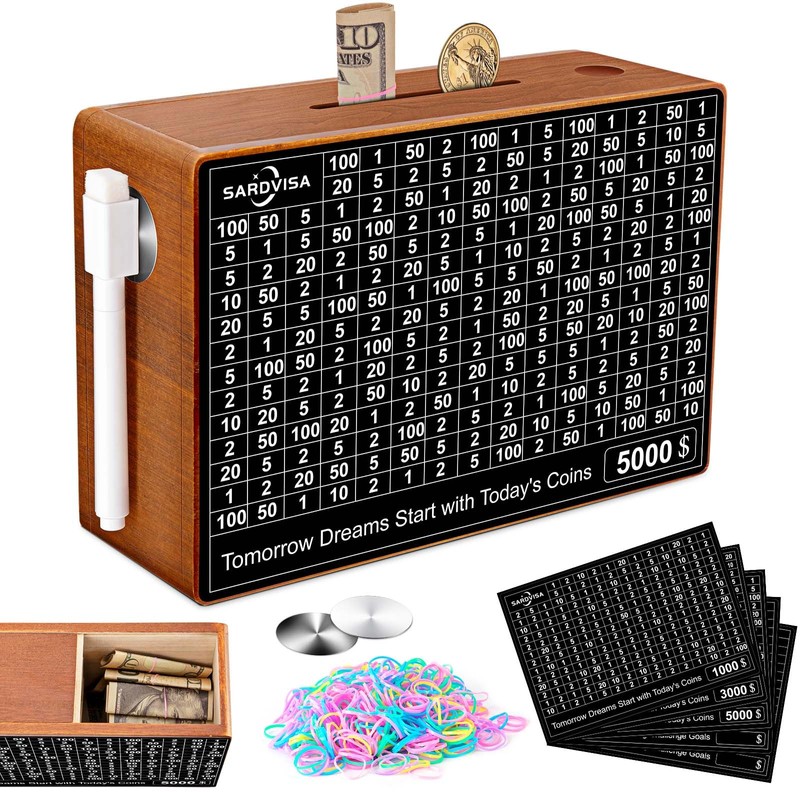 SARDVISA Wooden Money Saving Box, Upgraded All-in-One Cash Savings Box with 10k, 5k, 3k, 1k Challenge Target Trackers, Reusable Piggy Bank for Adults & Kids, Cash Vault Bank w/Sliding Lid