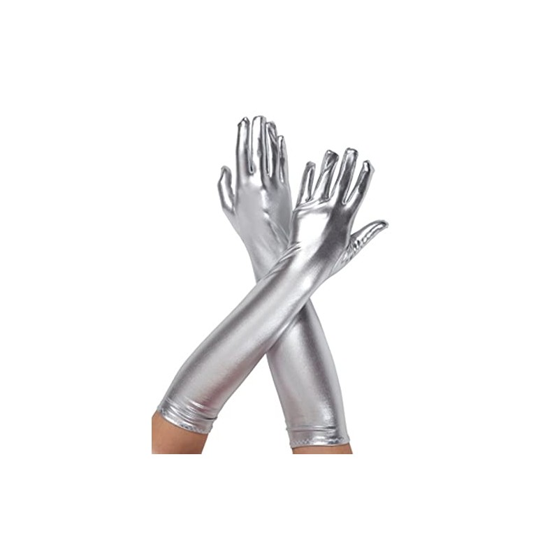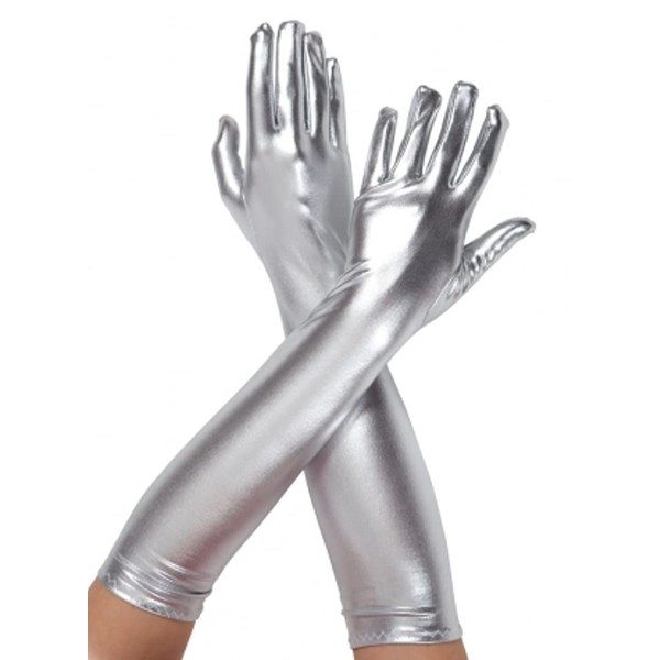 • Véritable arme de séduction, longues gants en satin élastique de couleurargent .
