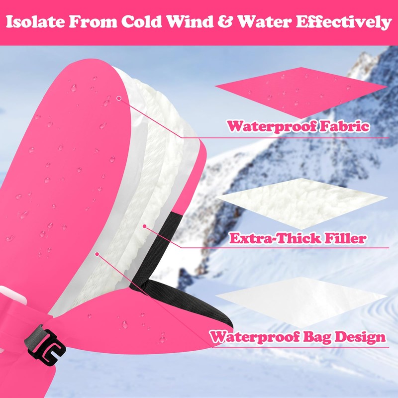 - ULTRA WARM & EFFECTIVE WATERPROOF: The toddler mittens waterproof are filled with thickened sherpa, which are super warm, soft and skin-friendly. The toddler snow gloves adopt a professional double-layer waterproof design. The outer layer of the toddler winter gloves features the premium splash-resistant fabric, while the inner has a built-in waterproof bag, which can prevent the penetration of melted snow and cold water to remain baby's hands dry and warm, allowing them to play more joyfully.