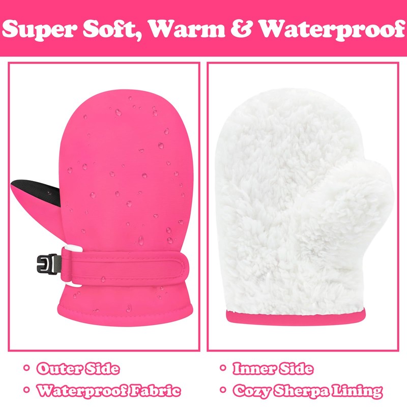 - EASY TO PUT ON & FIT SNUGLY: The toddler waterproof gloves feature an elastic band on the wrist that not only makes them easy to put on but also ensures a proper fit. The toddler snow mittens are equipped with widened hook and loop that can be flexibly adjusted to ensure the infant gloves stay securely on children's hands and prevent them from being blown off in strong winds. Additionally, this practical closure of the baby mittens can block out cold wind and keep long-lasting warm for children.