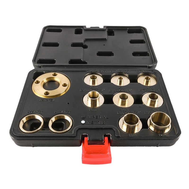 The 11-piece Router Guide Sleeve Set is a must-have accessory for anyone who works with routers. This versatile set provides a variety of sizes, ranging from 10mm to 30mm, enabling you to handle different types of routing projects, whether it's trimming edges, cu-tting dovetails, or reaming holes. Each guide sleeve is made from robust brass, ensuring smooth movement and durability during extensive use. The inclusion of 2 locknuts and 1 adapter guarantees a secure fit, preventing any shifting while you work. Whether you're a professional woodworker or a DIY enthusiast, this set is designed to meet your routing needs with flexibility and precision.