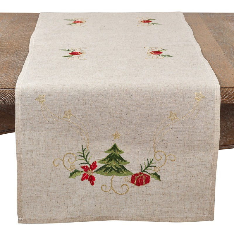 SARO LIFESTYLE Arbre de Noël Collection Embroidered Christmas Tree Design Linen Blend Table Runner, 16" x 54", Natural