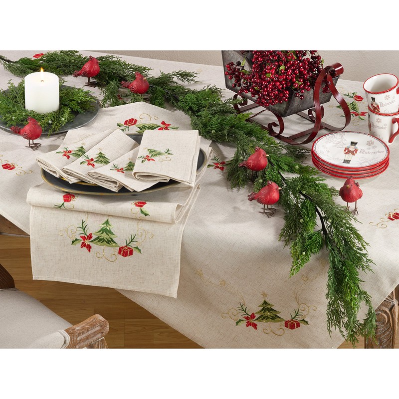 SARO LIFESTYLE Embroidered Christmas Tree Design Linen Blend Tablecloth, Natu...