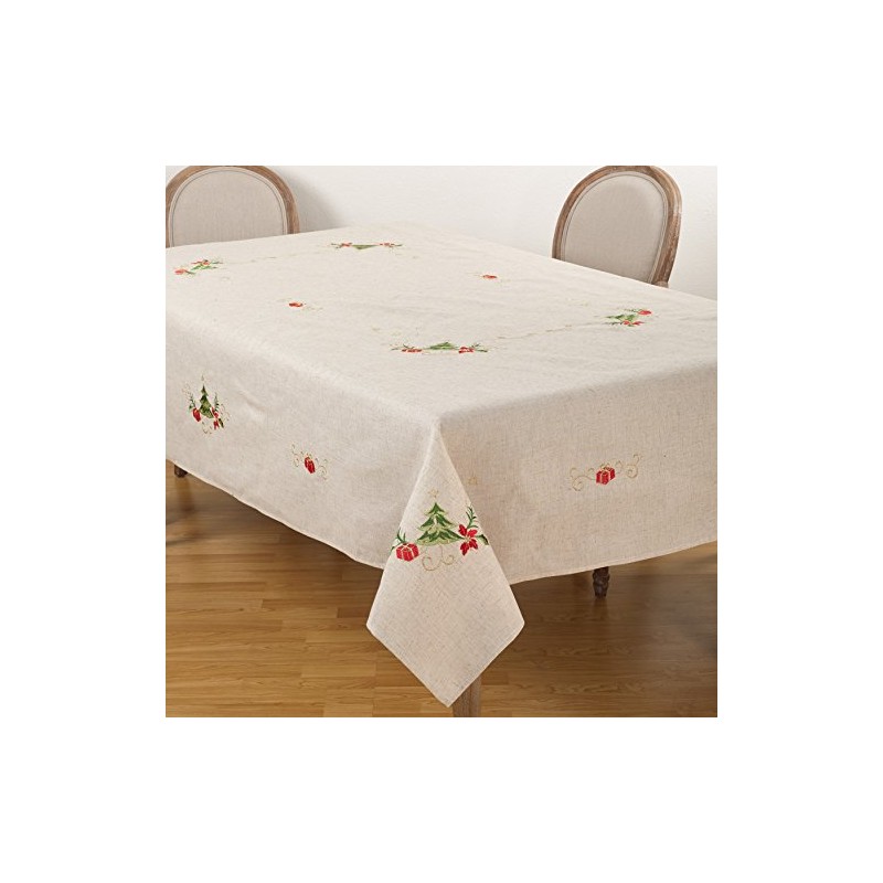 SARO LIFESTYLE Embroidered Christmas Tree Design Linen Blend Tablecloth, Natural, 67" x 104"