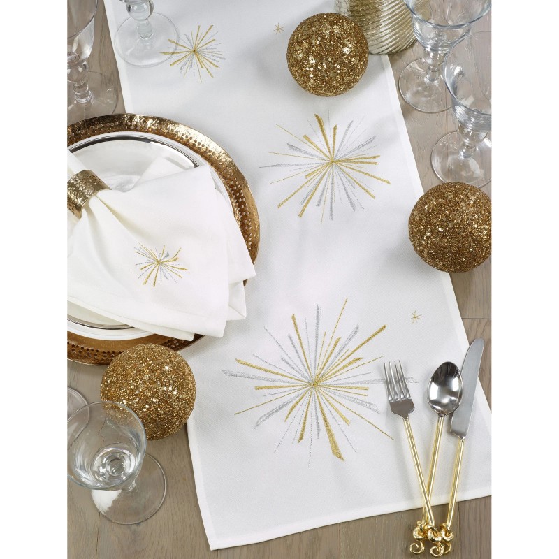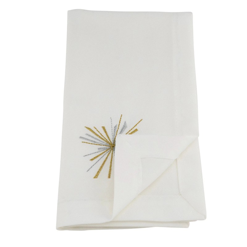 A beautiful set of table napkins, feature a gorgeous starburst design come in handy for many occasions. Pair with a minimal gold or silver napkin ring to add a refined and sophisticated look to your table décor. Coordinate with the matching runner.