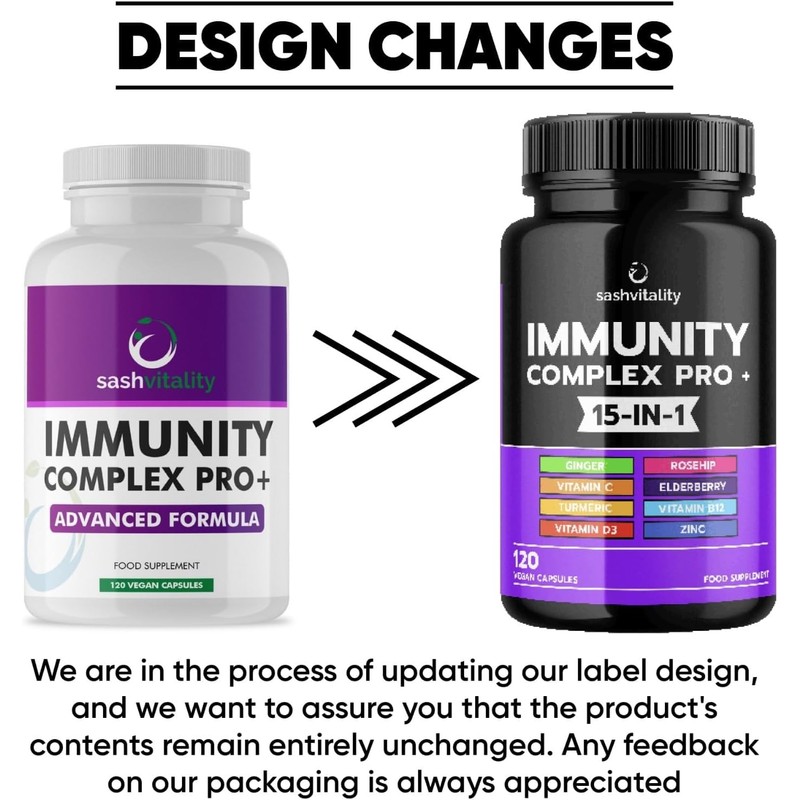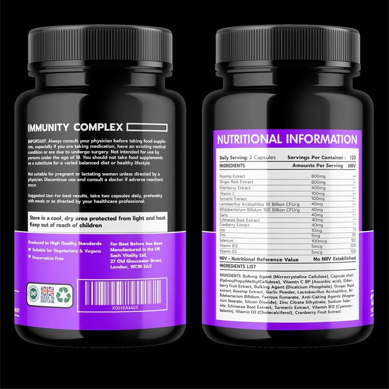 Sash Immune Complex – 120 Vegan Capsules with 15 active ingredients, including Elderberry, Turmeric, Ginger, Rosehip, Garlic, Echinacea, Cranberry, Vitamins D, C, B12, Iron, Zinc, Selenium, and Probiotics. Designed for all-year-round immune support, gut health, and overall vitality. Made in the UK, allergen-free, non-GMO, and certified vegan. Eco-friendly packaging with recyclable bottles.
