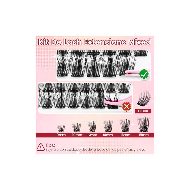 SASHA Extensin Pestaas Postizas Kit Completo, 144 Racimos Individuales Kit de Pestaas, Curvatura Tipo D Longitud Mixtas 9-18mm, Incluye 4 en 1...