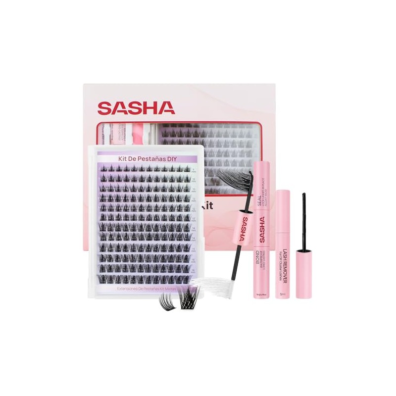 SASHA - SASHA Extensión Pestañas Postizas Kit Completo, 144 Racimos Individuales Kit de Pestañas, Curvatura Tipo D Longitud Mixtas 9-18mm, Incluye 4 en 1 Herramienta Lash Bond y Seal y Remover y Pinzas
