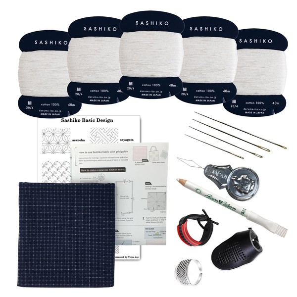 Sashiko kit, Daruma Sashiko Thread, Needles and Cotton Fabric with Grid Line Print, Marking Pencil, Thimblem and Traditional Design Sewing Set (Unbleached Thread/Navy Fabric)