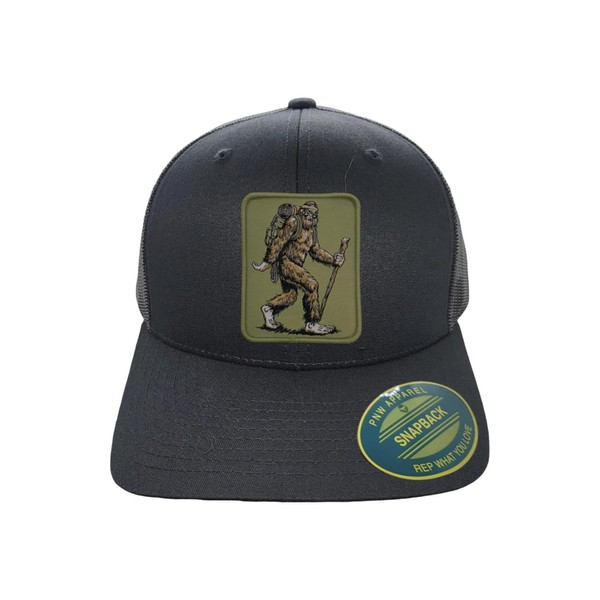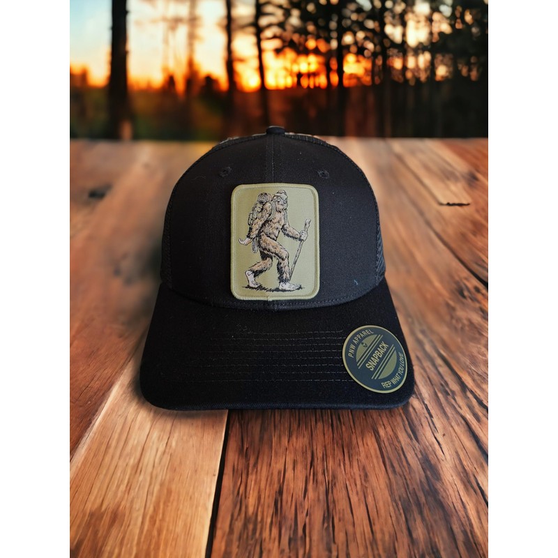 Sasquatch Trucker Hat - Snapback Cap - Big Foot Hiker Patch (Black/Black)