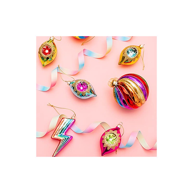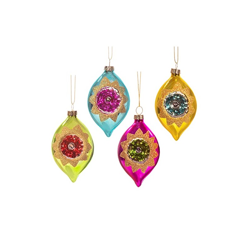 Welcome retro vibes into the home this Christmas with our set of four baubles. Made from glass in a tear drop shape, these festive decorations feature a metallic colourway of green, yellow, blue and purple. Encrusted with a jewel in the centre and inspired by the beauty of vintage glamour.