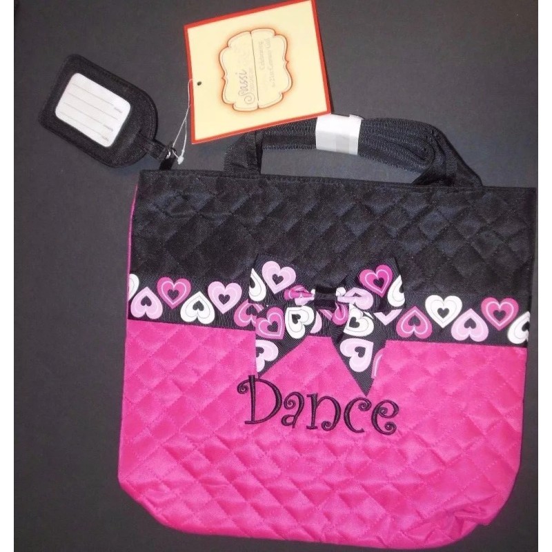 Brand new dance bag with original Sassi Designs Dance hang tag. This fully lined black and rasberry quilted tote has shoulder straps There is a zippered pocket on the inside and an open pocket on the inside. Dimensions are 11" x 11" x 3". It features an embroidered Dance on the front with a grosgrain ribbon detail of open hearts. This bag is perfect, no irregularities. Style # HRT-01. upstrs