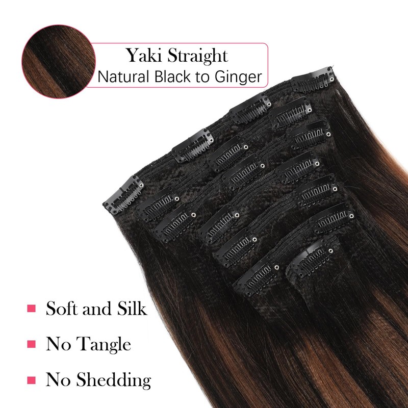 Sassina Light Yaki Straight Clip ins Human Hair Extensions Thick Clip in Hair Extensions Two Tone Natural Black to Light Auburn Clip in Extensions for Full Head 120 Grams 7 Pcs with 17 Clips 14 Inch