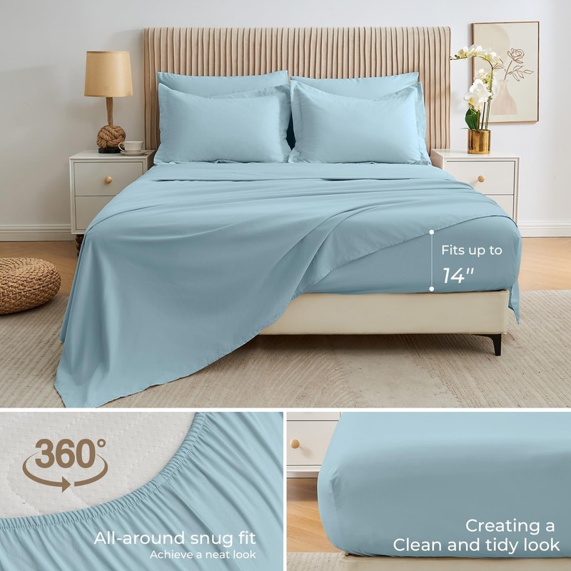 - Thoughtful Details: The 360° elastic fitted sheet fits mattresses up to 14'' deep, ensuring all-around snug fit. The smooth, breathable flat sheet ensures ultimate comfort while remaining whisper-quiet, allowing for a restful night's sleep