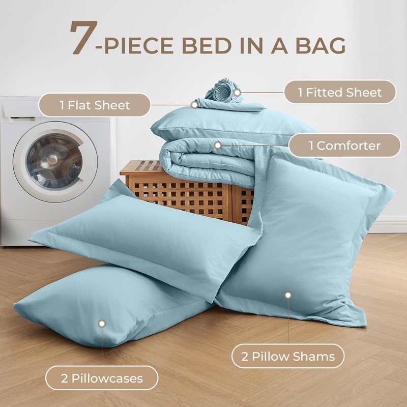 - Bed in a Bag Queen: Includes 1 comforter (88"x88"), 1 flat sheet (90"x102"), 1 fitted sheet (60"x80"+14"), 2 pillowcases (20"x30"), and 2 pillow shams (20"x26"+2") to complete your bed in one step. For a more embracing feel, you may opt for a size larger
