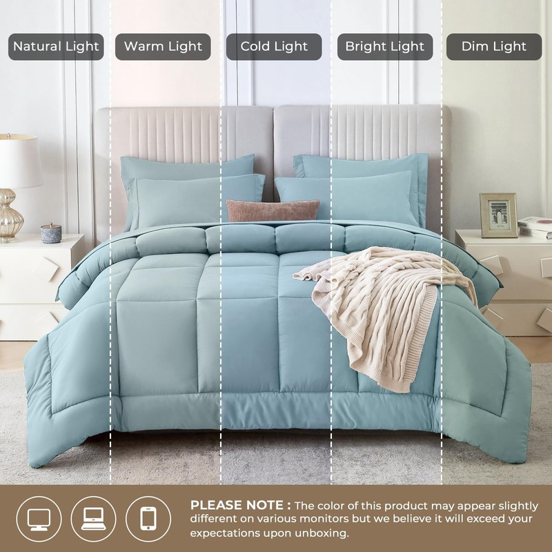 Upgrade your bedroom with this complete bedding solution, designed to provide softness, warmth, and style. The comforter set features a lightweight yet breathable down-alternative filling, perfect for year-round use. Its ultra-soft microfiber fabric offers a cozy touch, while the 360° elastic fitted sheet fits mattresses up to 14’’ easily. The sewn-through box quilting keeps the filling evenly distributed, preventing from clumping and ensuring consistent warmth.