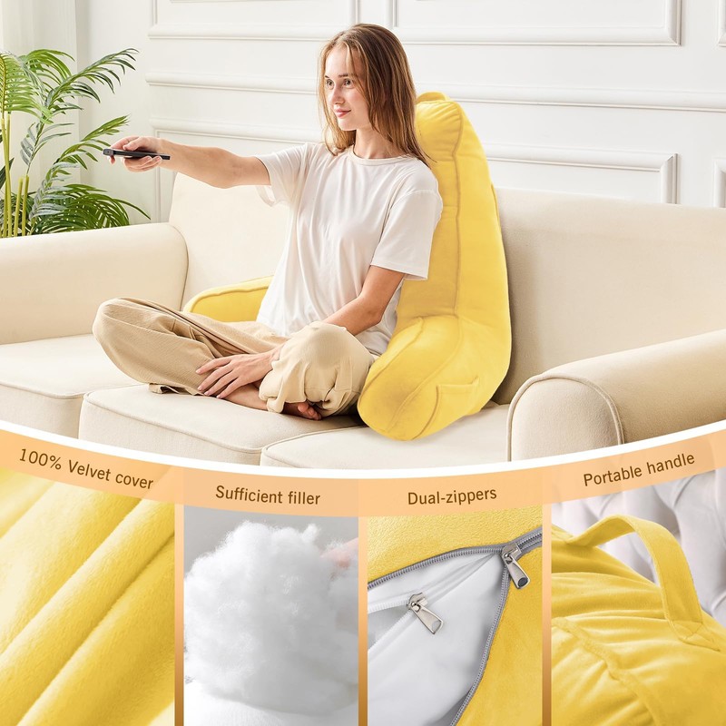 Sasttie Reading Pillow for Bed - 23 Inch, Back Pillow for Bed Sitting Up, Back-Rest Support Cushion with Side Pockets and Arms, Dorm Essentials, Oeko-Tex Certified, Yellow