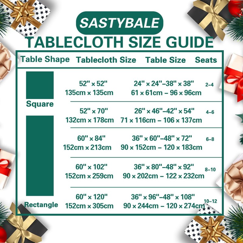 SASTYBALE Christmas jacquard Tablecloth are available in a large selection of sizes and shapes for all of your holiday entertaining needs. Sizes available are: 20x20 napkin , 52 x 52 Square , 52 x 70 Rectangular, 60 x 84 Rectangular, 60 x 102 Rectangularl,60 x 120 Rectangular. Perfect for decorating for Harvest, Autumn and Thanksgiving, Christmas and Winter Holiday parties, banquets, dinners, entertaining and everyday use.