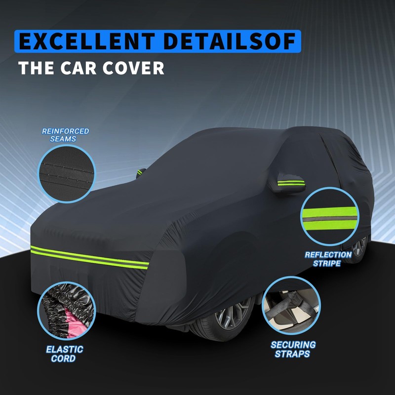 - Enhanced Safety Features: Safety is a top priority; our car cover comes with four reflective strips for increased visibility during nighttime, reducing the risk of accidents. Mirror pockets ensure a precise fit.