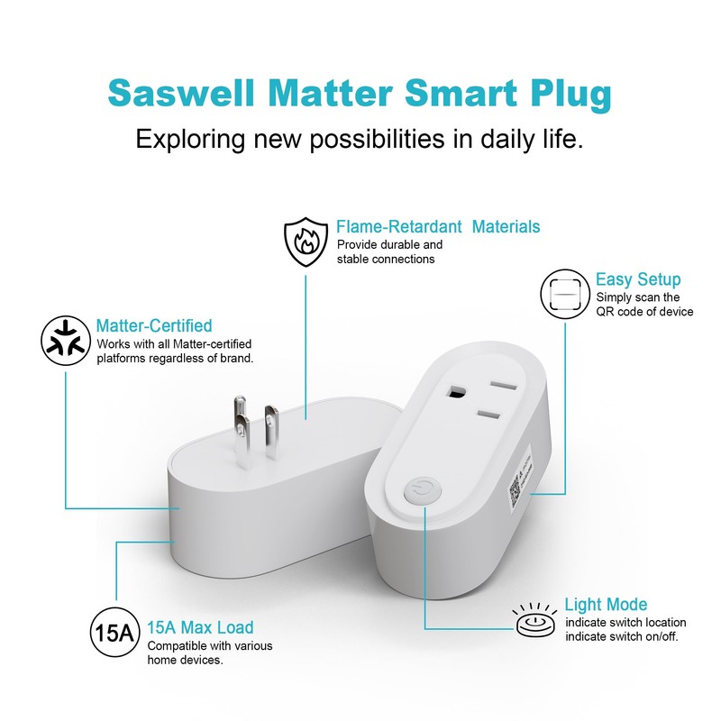 SASWELL Matter Smart Plug, Work with Apple Homekit, Alexa & Google Home, WiFi Outlet with 15A/1800W Max, Voice Control, Supports Energy Monitoring by Tuya, 2.4GHz Wi-Fi Only, 4 Pack