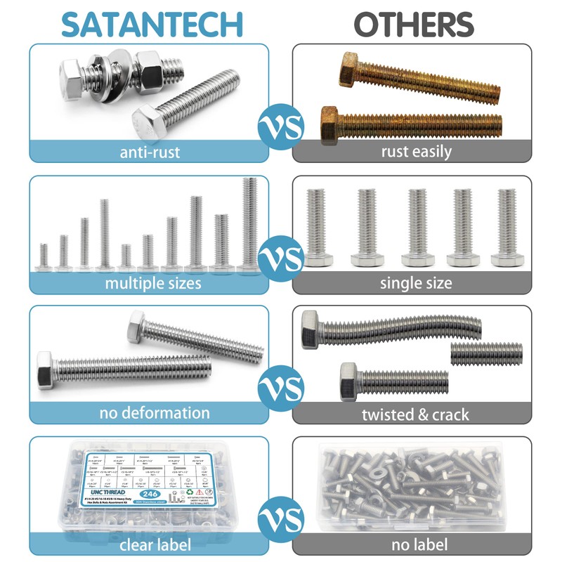 SATANTECH 246PCS Hex Head Nuts and Bolts Assortment Kit, Stainless Steel 1/4-20, 5/16-18,3/8-16 Bolts and Nuts Kit, Assorted Nuts and Bolts, Flat & Spring Lock Washers with Case