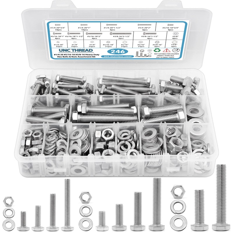 - 【Bolts Nuts and Washer Assortment Kit】: Various sizes of 1/4", 3/8", 5/16"nuts and bolts, flat washers, spring washers 246pcs in total, standard hex heads screws , clear threads, even force, precise grip, speeding up the fastening process in many applications.