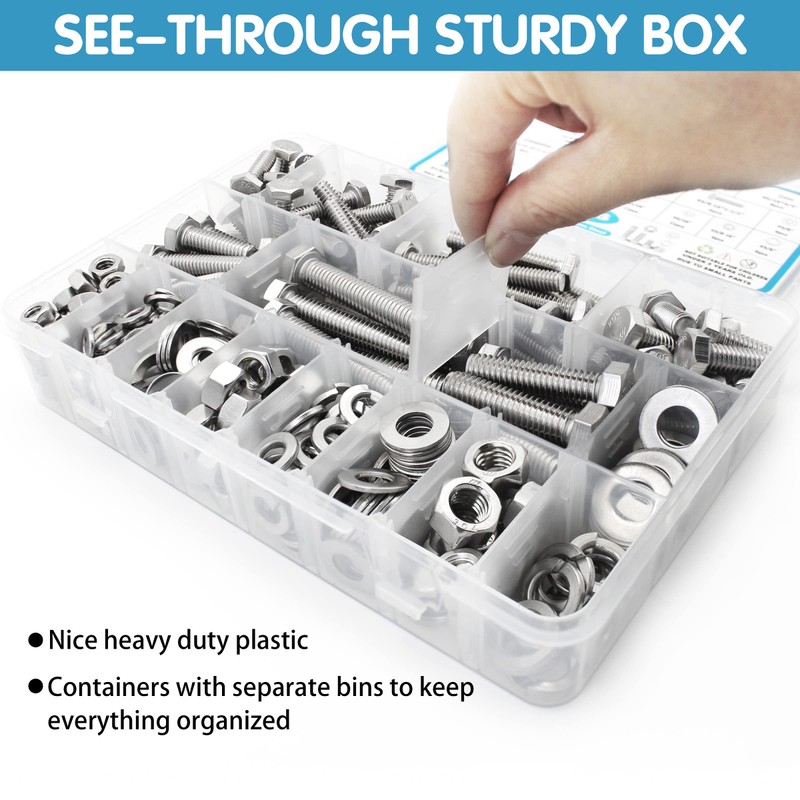 - 【Box with Compartments】: Bolts and nuts are stored in separate compartments inside the box , everything is kept in order, easy to take and storage. The reinforced box with detailed size information sheet pasted on both sides, even if mixed, can be quickly corresponded to the correct size.