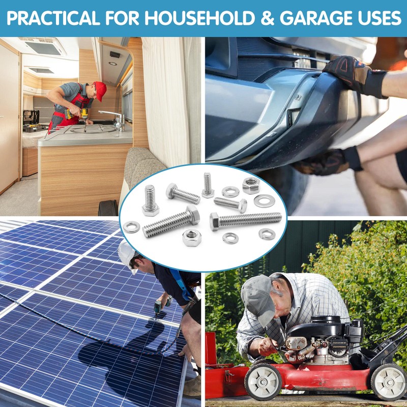 - 【High Quality 304 Stainless Steel】: Nuts and bolts, washers are 100% made of high quality 304 stainless steel, which has superior anti-rust and abrasion resistance, anti-oxidation, corrosion resistance, no deformation, sturdy and durable, ensuring the service life of nuts and bolts.