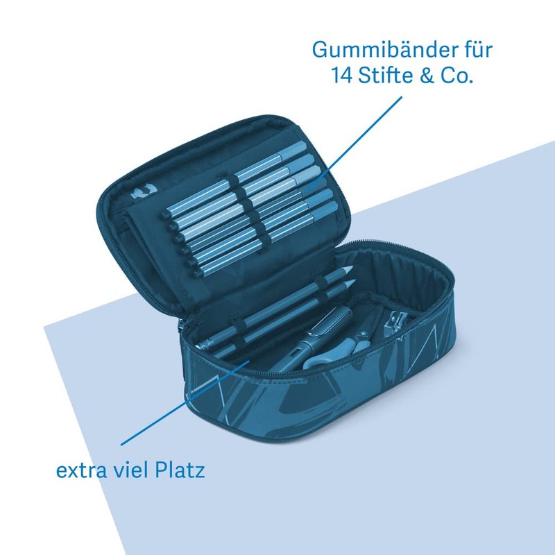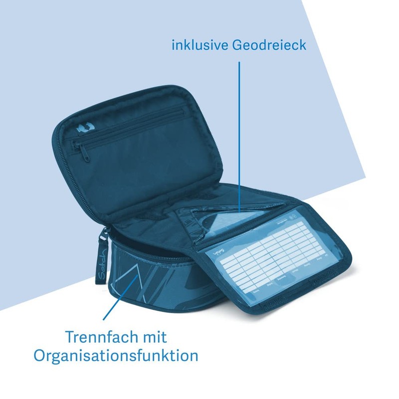 • Box contents: Pencil case with a set square, timetable, zip pocket, colourful bands for pens and more. Dimensions: (L x W x H): 22 x 10 x 6 cm