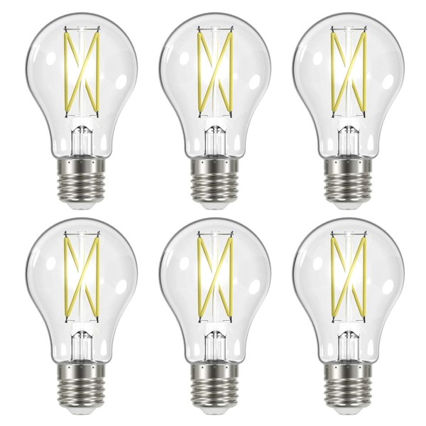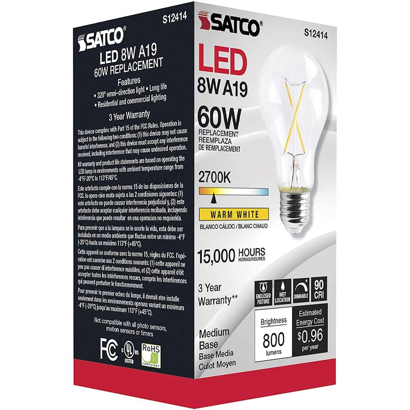 Satco (6 Pack) Dimmable Led Filament Lamps, S12414, High Lumens, 8 Watt, A19; Clear; Medium Base; 2700K; 90 CRI; 120 Volt for use at Residential, Hospitality, Display and Commercial