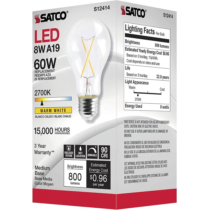 - SAVE WITH THIS MASTER CARTON: Includes 6 LED light bulbs in the manufactures master carton, each in it's own retail packaging. Satco Item S12414 (8A19/CL/LED/E26/927/120V) UPC (each): 045923124143; replaces Satco S29876 (7A19/CL/LED/E26/27K/ES/120V) UPC 045923298769 which has been discontinued.