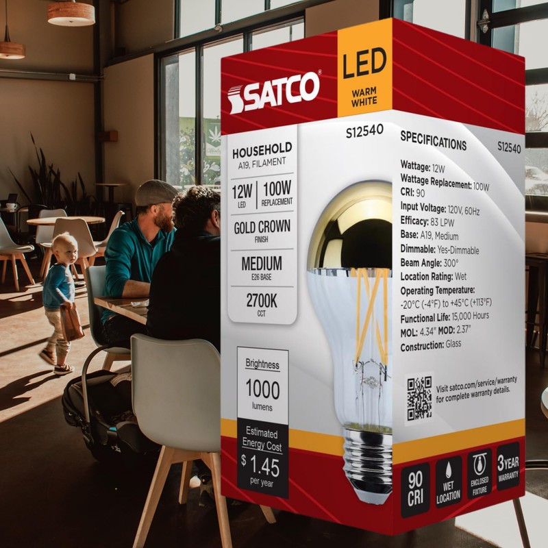 Satco LED A19 Lamp 12W 100W Equivalent 2700K Warm White 90+ CRI Gold Crown Medium Base 120V Dimmable – Part S12540 (6 Pack)