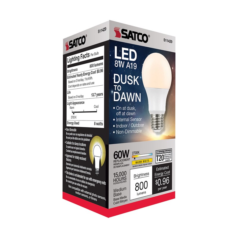 Satco S11429 Dusk to Dawn A19 LED Light Bulb, 60W Replacement, 2700K, Frosted