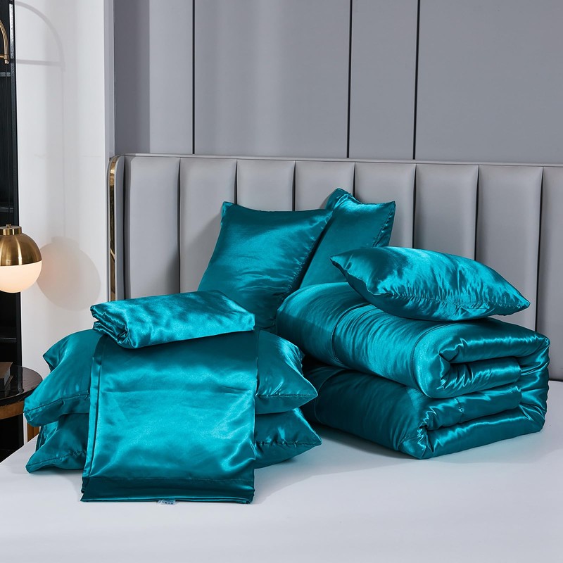 - LUXURY SILK LIKE IMITATED FABRIC - European style satin comforter set with sheet Set. Artificial silk combine the advantages of silk and artificial materials, full of luxury texture. The appearance of the fabric is softer and elegant, like the luster of the pearl; Super smoothly, soft and comfortable, flexible. Texture is also relatively thin, feel crisp. Cool skin care in summer, color is extra bright and gorgeous, it's best for you to decorate luxury and charming style bedroom in all season.