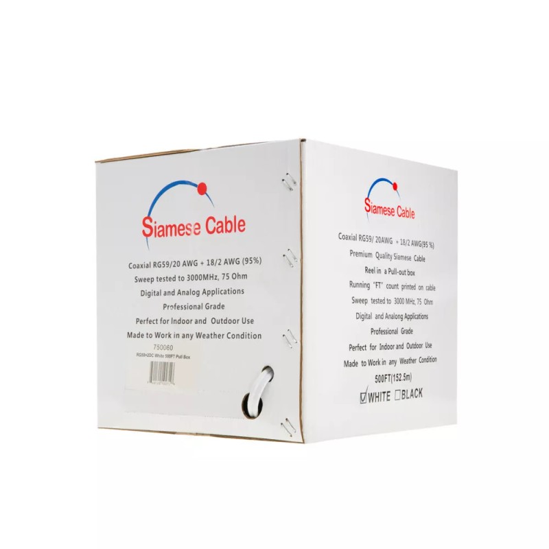 SatMaximum 500ft RG59 Siamese Coax Cable 20AWG+18/2 CCTV Security Camera Bulk Wire White