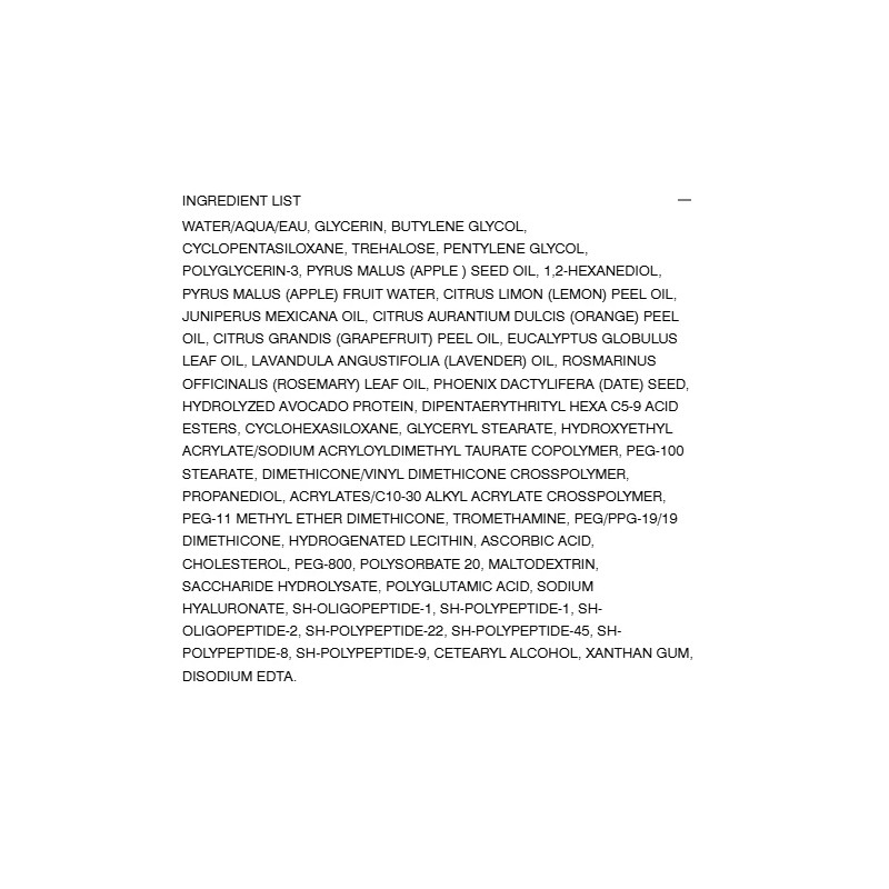 Ingredients: WATER/AQUA/EAU, GLYCERIN, BUTYLENE GLYCOL, CYCLOPENTASILOXANE, TREHALOSE, PENTYLENE GLYCOL, POLYGLYCERIN-3, PYRUS MALUS (APPLE ) SEED OIL, 1,2-HEXANEDIOL, PYRUS MALUS (APPLE) FRUIT WATER, CITRUS LIMON (LEMON) PEEL OIL, JUNIPERUS MEXICANA OIL, CITRUS AURANTIUM DULCIS (ORANGE) PEEL OIL, CITRUS GRANDIS (GRAPEFRUIT) PEEL OIL, EUCALYPTUS GLOBULUS LEAF OIL, LAVANDULA ANGUSTIFOLIA (LAVENDER) OIL, ROSMARINUS OFFICINALIS (ROSEMARY) LEAF OIL, PHOENIX DACTYLIFERA (DATE) SEED, HYDROLYZED AVOCADO PROTEIN, DIPENTAERYTHRITYL HEXA C5-9 ACID ESTERS, CYCLOHEXASILOXANE, GLYCERYL STEARATE, HYDROXYETHYL ACRYLATE/SODIUM ACRYLOYLDIMETHYL TAURATE COPOLYMER, PEG-100 STEARATE, DIMETHICONE/VINYL DIMETHICONE CROSSPOLYMER, PROPANEDIOL, ACRYLATES/C10-30 ALKYL ACRYLATE CROSSPOLYMER, PEG-11 METHYL ETHER DIMETHICONE, TROMETHAMINE, PEG/PPG-19/19 DIMETHICONE, HYDROGENATED LECITHIN, ASCORBIC ACID, CHOLESTEROL, PEG-800, POLYSORBATE 20, MALTODEXTRIN, SACCHARIDE HYDROLYSATE, POLYGLUTAMIC ACID, SODIUM HYALURONATE, SH-OLIGOPEPTIDE-1, SH-POLYPEPTIDE-1, SH-OLIGOPEPTIDE-2, SH-POLYPEPTIDE-22, SH-POLYPEPTIDE-45, SH-POLYPEPTIDE-8, SH-POLYPEPTIDE-9, CETEARYL ALCOHOL, XANTHAN GUM, DISODIUM EDTA.